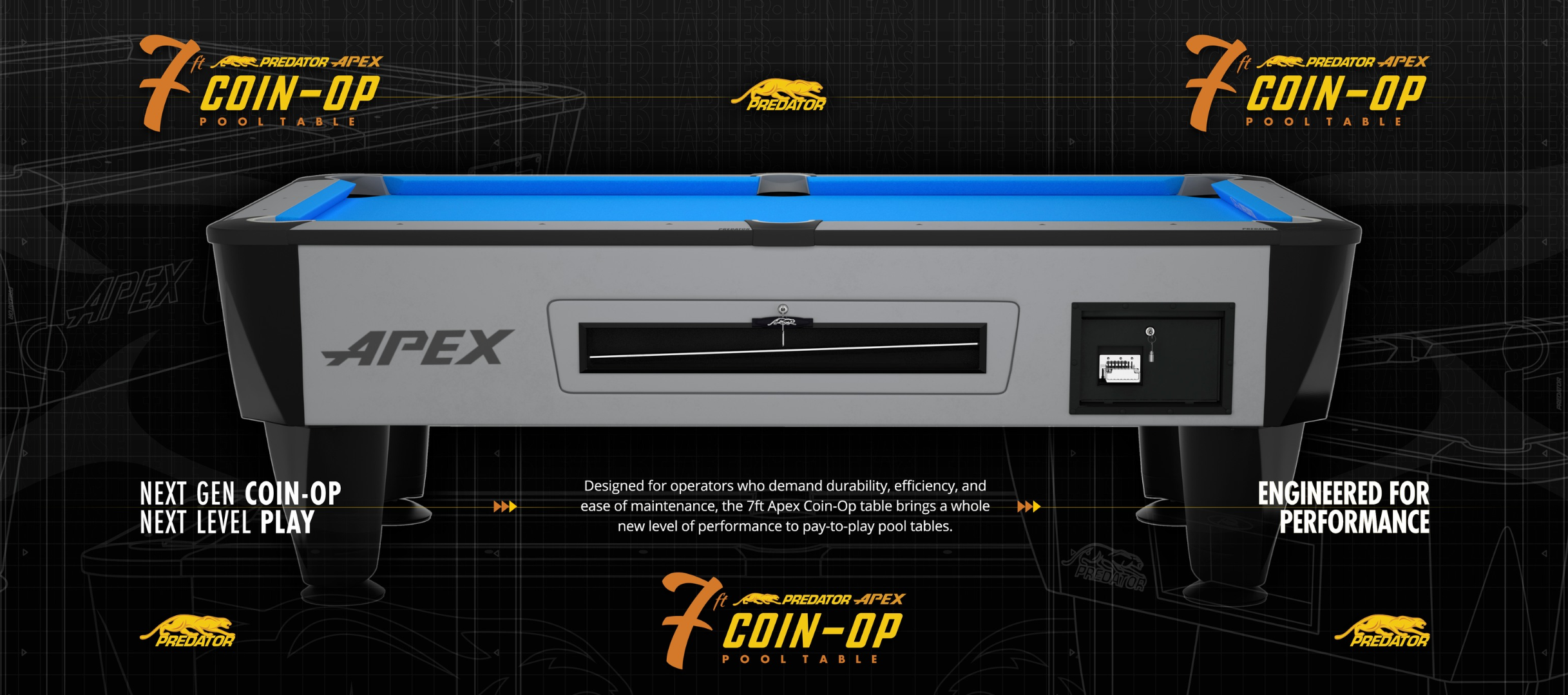 The Apex 7ft Coin-Op Table is a tournament-grade design built to deliver professional performance while enhancing durability and efficiency in commercial settings. Equipped with K55 Pro Speed Cushions and Predator Arcadia Pr by Simonis cloth, it offers a fast, reliable, and highly accurate playing experience. Its high-end Italian Laminati finish provides a clean, fingerprint-resistant look, while flush pockets with dampener foam ensure quieter, smoother ball capture.